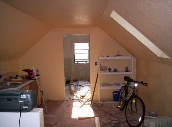 It's the 3rd-floor attic apartment. It is small, and half of the walls are slanted. I am an idiot for not taking pictures, but I didn't. However, google image search helps me out here for me to say that the bedroom has the shape of this or this (although not as awesome as the second image, of course) except the slanted walls extend out far enough for the portion wherein they are vertical to be, hrm, 3 feet high? So some space that is intriguing as far as use. There were a couple of guys viewing the apartment as I did, and they left complaining they were claustrophobic in the space for being too tall. But... I'm not that tall. So the space is a challenge, but not a dealbreaker. It's not an apartment that will ever host parties, though, and tall visitors would have to be conscious of their heads. ;)